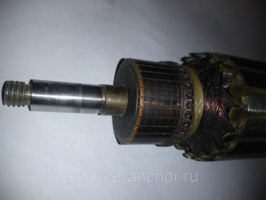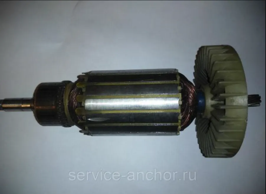 Ремонт якоря электродвигателя рейсмуса КРАТОН WMT-02 с перемоткой обмотки. Коллектор оплачивается отдельно Поступивший в ремонт электродвигатель рейсмуса прошел диагностику на неисправность узлов. Выявились неисправности видимые и скрытые дефекты узлов рейсмуса. Статор и якорь прошел проверку на пробой изоляции. В данном инструменте поломка произошла по причине неисправности ножей вала. Ножи вала затупились. Глубина обработки древесины была выше нормы. Якорь уменьшил скорость вращения. Увеличился ток потребления. Температура якоря достигла предела величины нагрева разрушения эмали провода. Произошло замыкание в секциях якоря. Перегрелся коллектор. Приподнялись и выскочили ламели в якоре. Неисправность якоря определяются методом проверки на витковое замыкание. Пробой изоляции коллектора. Пробой пазовой изоляции на корпус якоря. Считывается схема намотки. Направление намотки. Направление укладки. Схема распайки. Устанавливается пазовая изоляция. Укладка обмотки вручную. Сборка схемы. Установка дополнительной защитной брони на обмотку якоря. Пропитка специальным лаком. Балансировка. Рекомендуем обязательно присылать электродвигатель в сборе. Особенности услуги: Послеремонтная гарантия